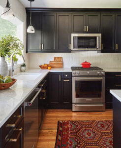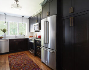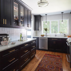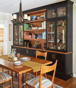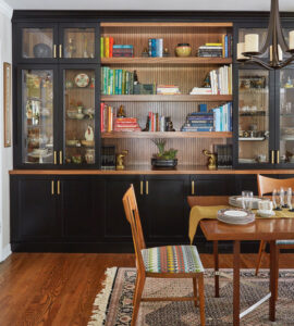 I was contacted by a former client to help her mother upgrade the kitchen in her tiny Chicago bungalow. She knew she wanted black cabinets and needed to add storage for her treasures and books. I designed a built-in cabinet with bookshelves for her dining area which also created much-needed storage space in the cabinets below the bookshelves. We installed brand new kitchen cabinets and countertops and added more modern hardware and accent colors. The result was a space that made the whole bungalow look refreshing and updated.